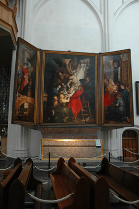 | ルーベンス作『キリスト降架』 アニメ『フランダースの犬』では、この絵の前でネロ少年と パトラッシュが昇天する。 ガイドブックによれば、アントワープでも昨今 『フランダースの犬』の物語が知られるようになったが、 その評判は芳しくない。物語の結末が悲惨な上に、自分達の 先祖が少年らを見殺しにした事実が面白くないのだ。 |