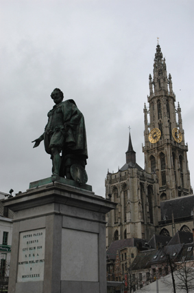 | ノートルダム寺院とルーベンス像 塔の高さ123メートル、ベルギー最大のゴシック教会。 1352年から約170年の歳月をかけて建設。 |