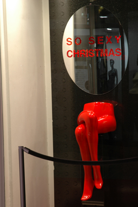 | 盗人サンタ 夕暮れ迫るの薄闇になると、サンタたちは壁に張り付く 盗人そのものに見える。 |