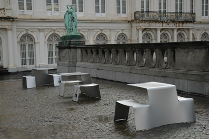 歴史的建造物の中に、吹けば飛んでいきそうなイスとテーブル