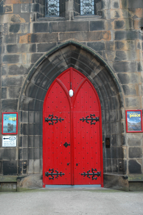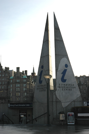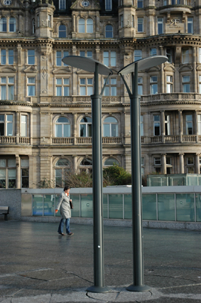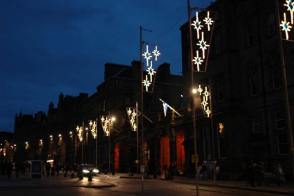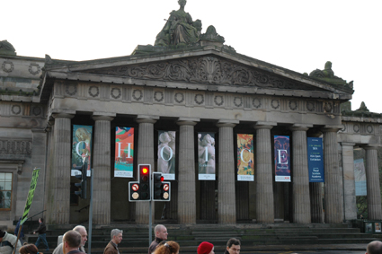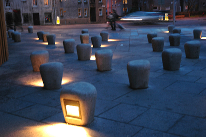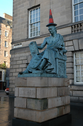 頭にカラーコーンをかぶったクリスマスバージョンの偉人像。