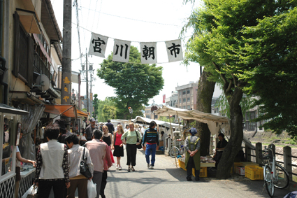 | 宮川朝市 陣屋前朝市と並んで、高山の名物。 毎朝、宮川を背にして屋台が軒を連ね、 野菜やら民芸品やらを並べている。 |